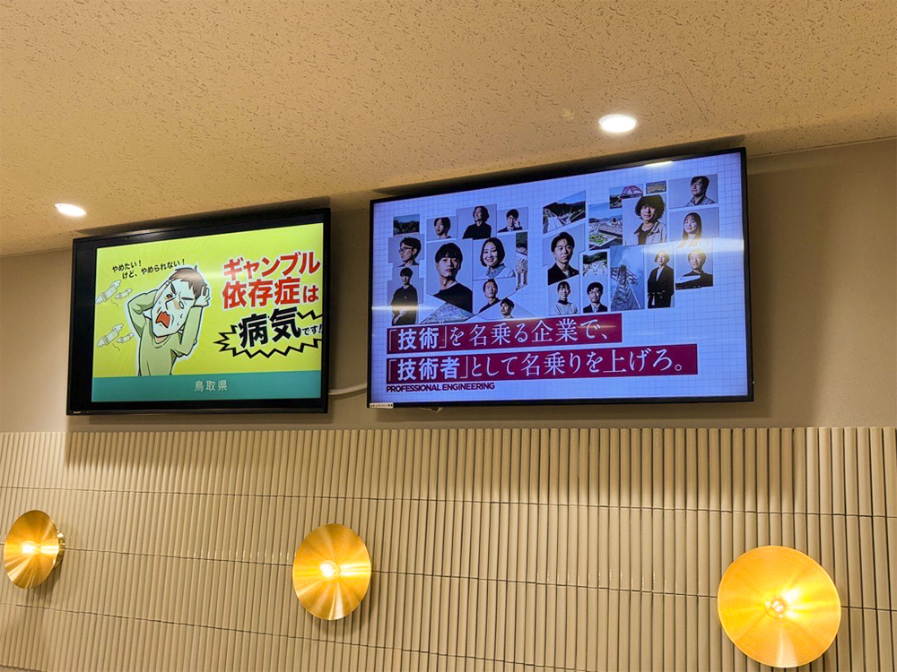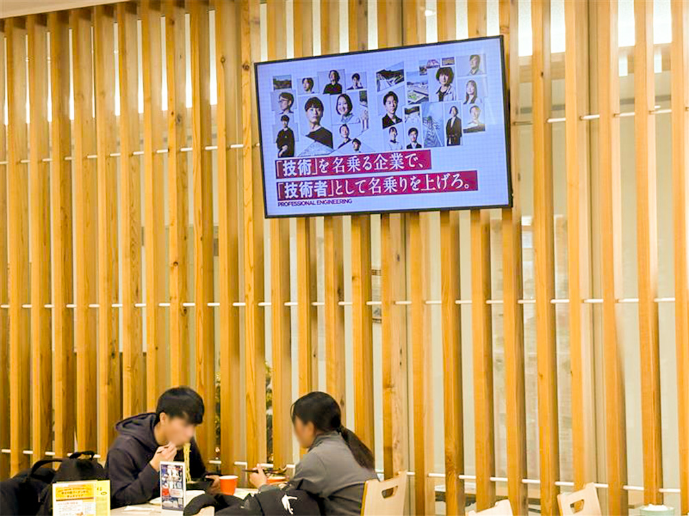 鳥取大学と島根大学にデジタルサイネージ広告を掲載しています。 多くの学生が日常的に利用する食堂で、当社の企業情報を届け、企業認知の向上や採用活動の強化を目指しています。